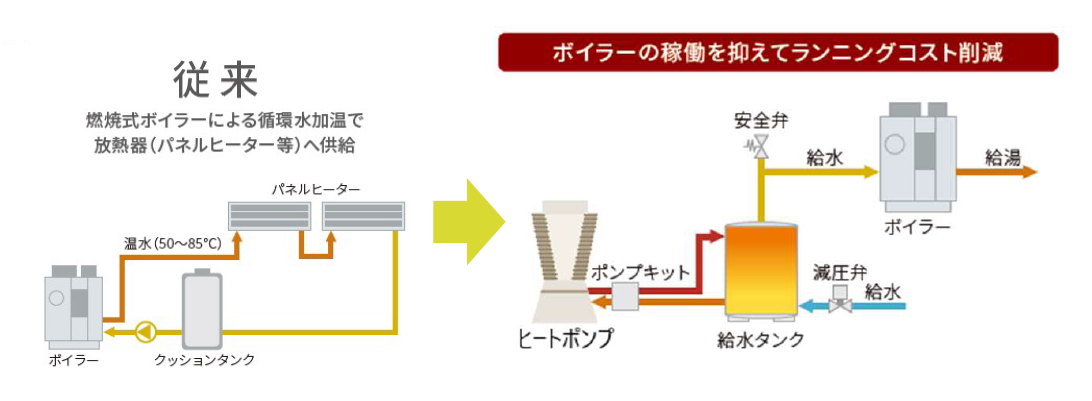 燃焼式熱源機からの転換、併用運転(ハイブリッド方式)で省エネに貢献
