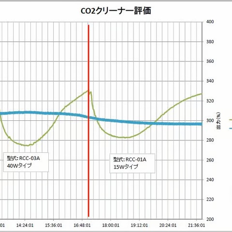 グラフは、毎分300ℓの空気に約1400ppmの二酸化炭素を混ぜ、CO2クリーナーがどれくらい濃度を下げる事ができるのかを試験したデータになります。