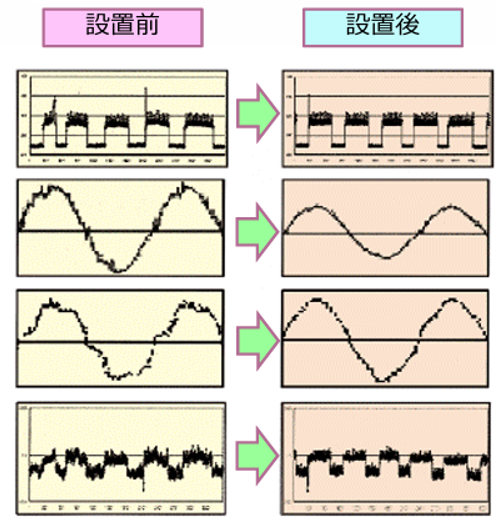 通常、送電線の抵抗成分による発熱や高調波ノイズ等の損失影響により、電流の構造に乱れが多く発生しており、これがロスとなり、負荷設備や電線に必要以上の電流が流れます。