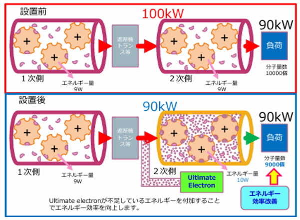 アルティメイトエレクトロンを設置する事で、送電線等で破壊された電流の分子構造を修復するイオン化した電子が放出されるので、1次側で乱れた電流を修復し、分子構造滑らかにするように働き、電気が流れる際のロスを少なくし、よって、電気を効率的に使用できる状態にする。電気的な効率が向上するため、設置前と同じ負荷を接続しても、節電につながります。